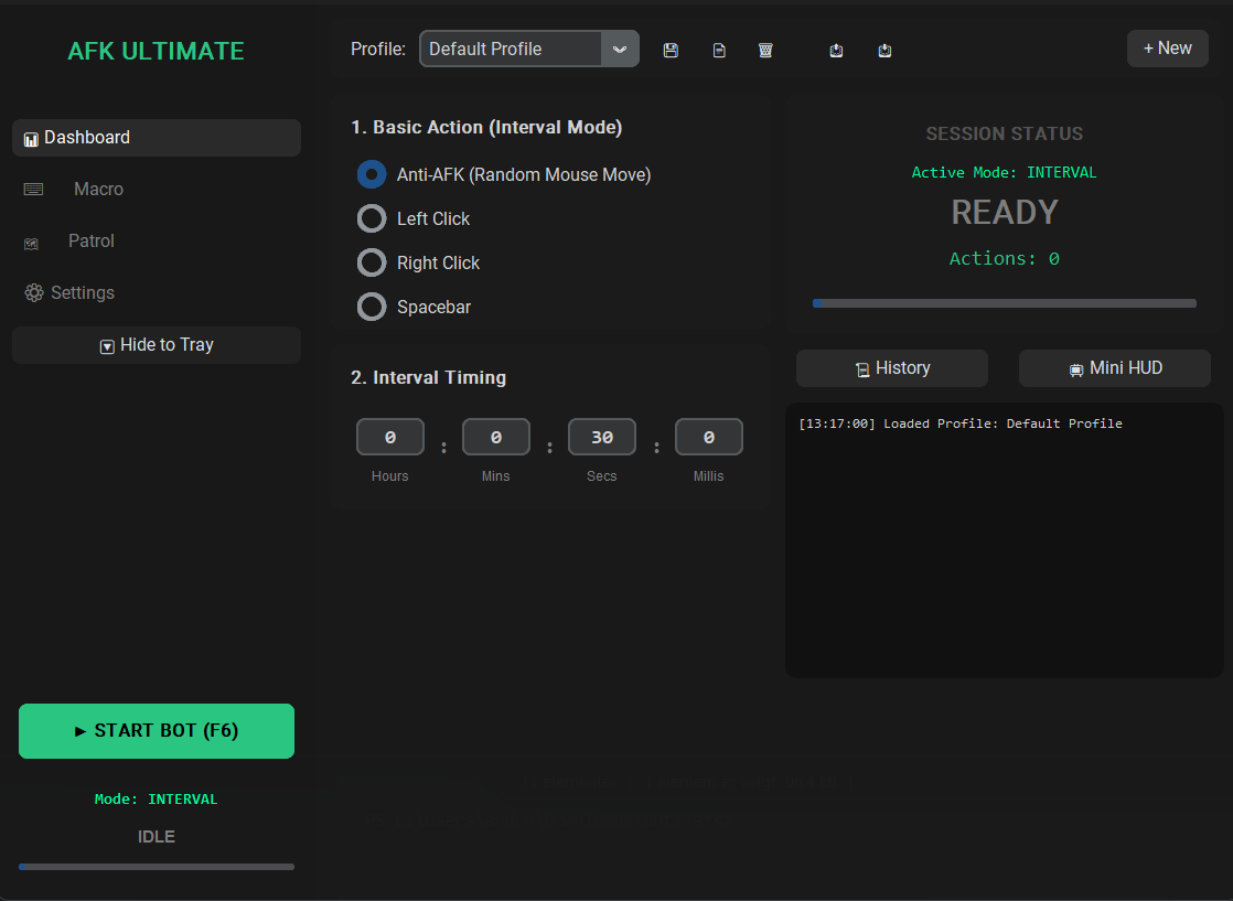 Just need to stay logged in? The Interval Mode randomly taps WASD and jitters the camera to guarantee you never hit the idle timeout screen.