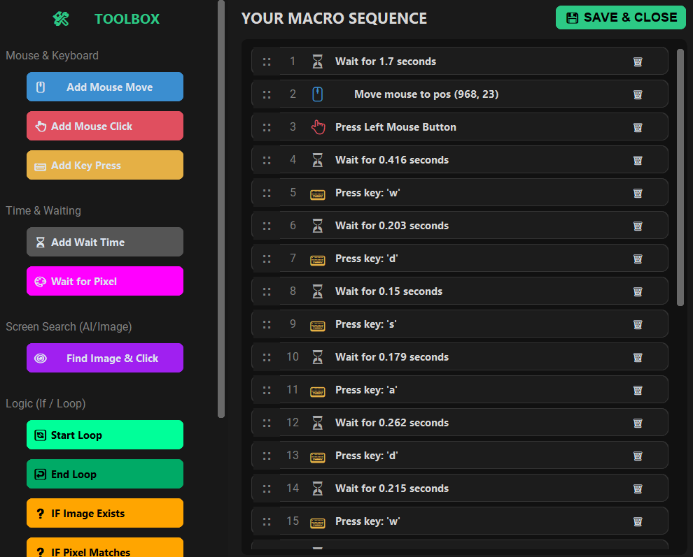 Don't just click coordinates blindly. Build logic-based sequences that react to the game environment. Perfect for complex looting, crafting, or combat rotations.